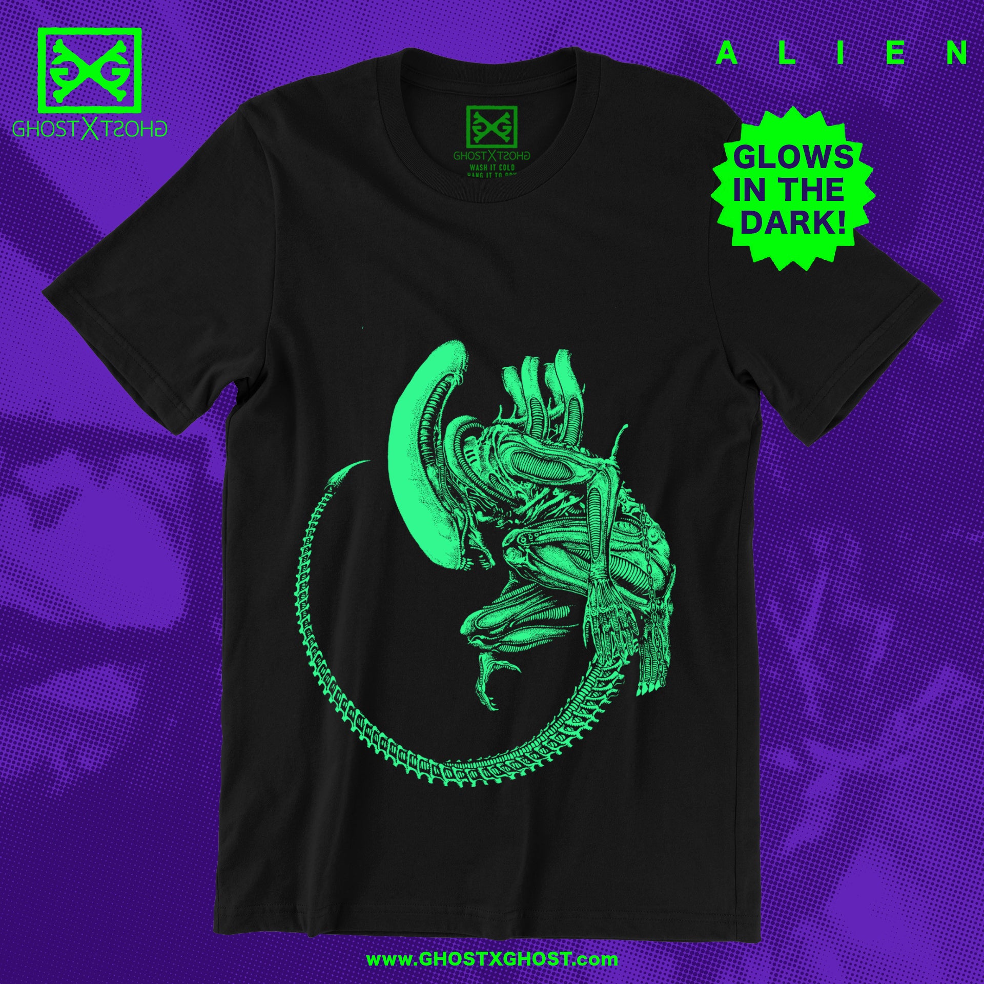 Screen printed on a 100% soft spun cotton black t-shirt with glow-in-the-dark ink.