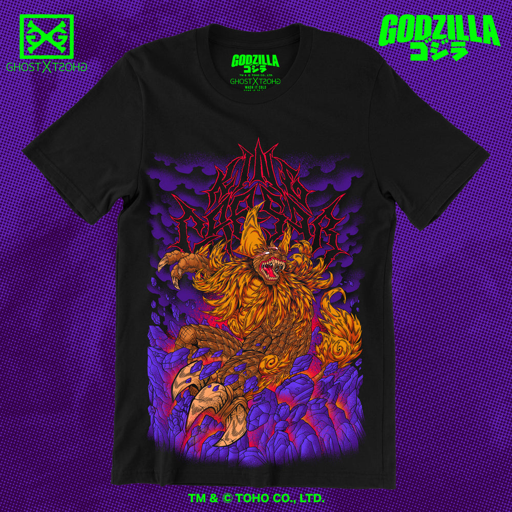 King Caesar, the guardian kaiju, has been reimagined as a metal band! This is the latest in our METALCROPOLIS series of designs- taking your favorite characters, and making them METAL!