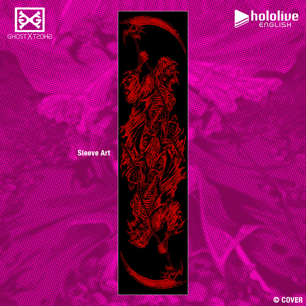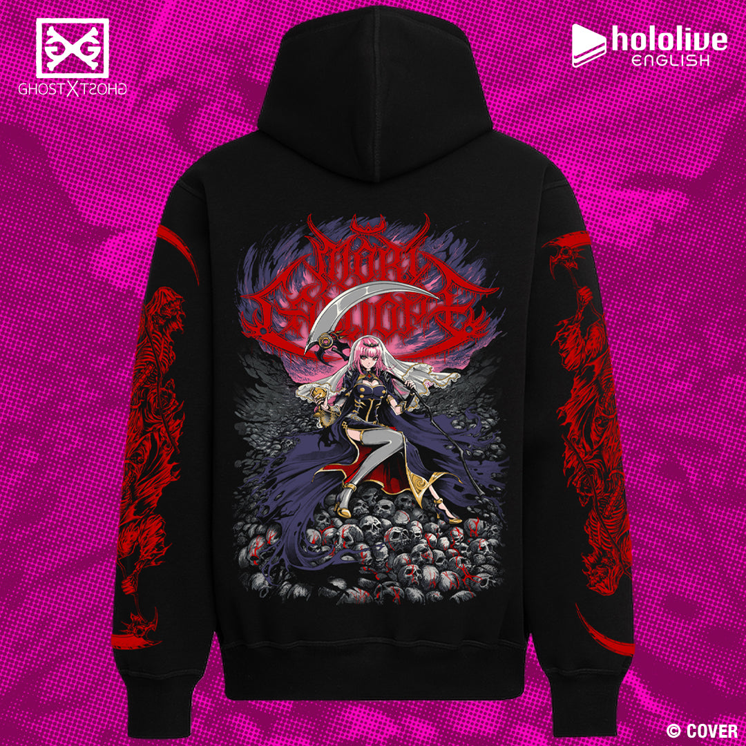 Mori Calliope, the Grim Reaper's apprentice from Hololive English MYTH, is next to the stage at METALCROPOLIS, our series of metal-inspired designs!